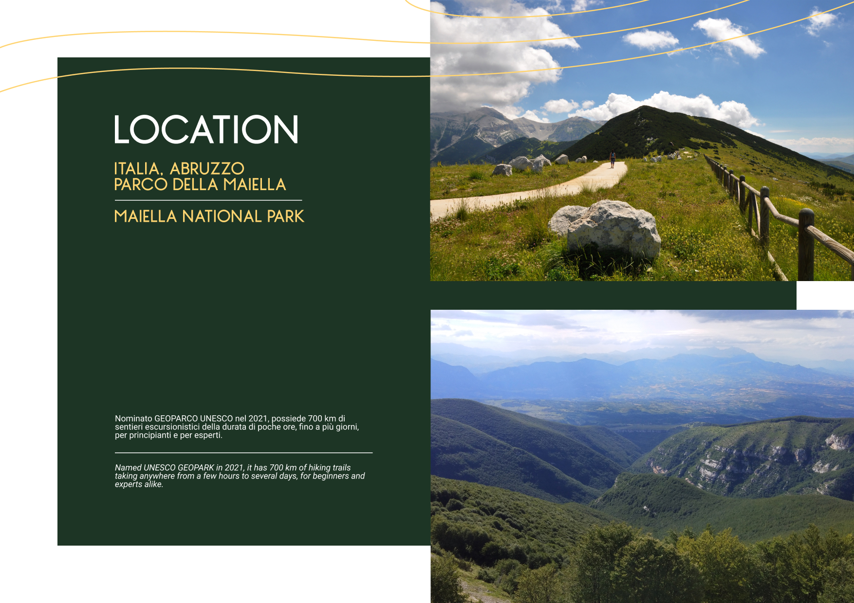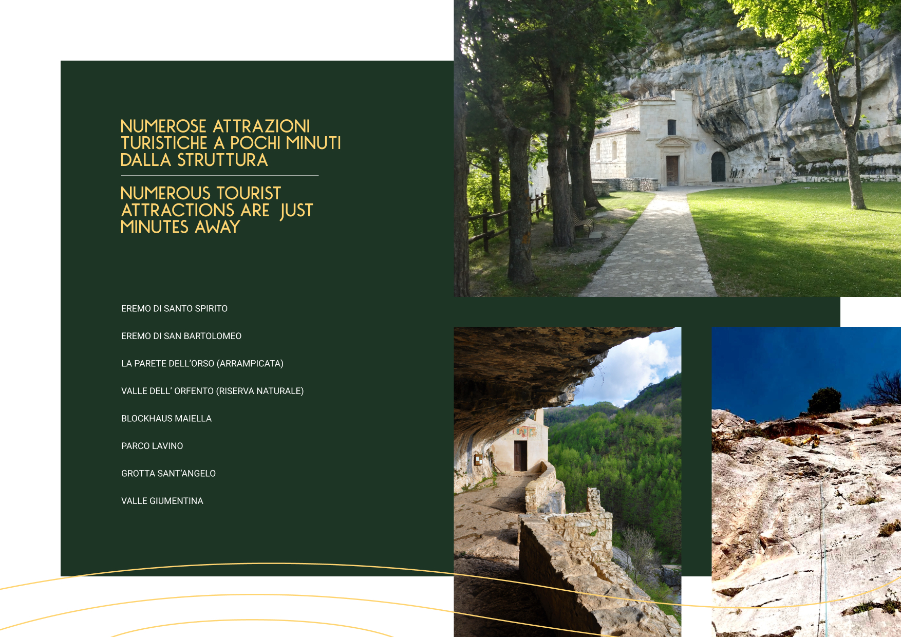 These symbols represent the Maiella mountain range and the typical landscapes of the central Apennines in Abruzzo, to be discovered through organized excursions and overnight stays, including outdoors.